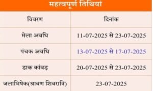 कांवड़ मेला की अवधि 11 जुलाई से 23 जुलाई तक रहेगी। पंचक अवधि 13 से 17 जुलाई तक, डाक कांवड़ 20 से 23 जुलाई तक तथा जलाभिषेक (श्रावण शिवरात्रि) 23 जुलाई को होगा।