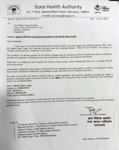 प्राधिकरण ने तत्काल अस्पताल को नोटिस जारी कर अपना पक्ष रखने और सख्त कार्रवाई की चेतावनी दी गई। मुख्य कार्यकारी अधिकारी रीना जोशी ने कहा कि आयुष्मान योजना में लाभार्थियों को भ्रमित करने या उपचार के नाम अवैध वसूली करना अपराध है।