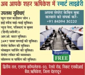 ऋषिकेश (रिपोर्टर)। शहर के रेलवे रोड छात्रों के लिए स्मार्ट लाइब्रेरी की शुरुआत हुई है। रेलवे रोड निकट एसबीआई में ब्रांच एसएम कॉम्पेक्स द्वितीय तल पर यह लाइब्रेरी बनाई गई है।